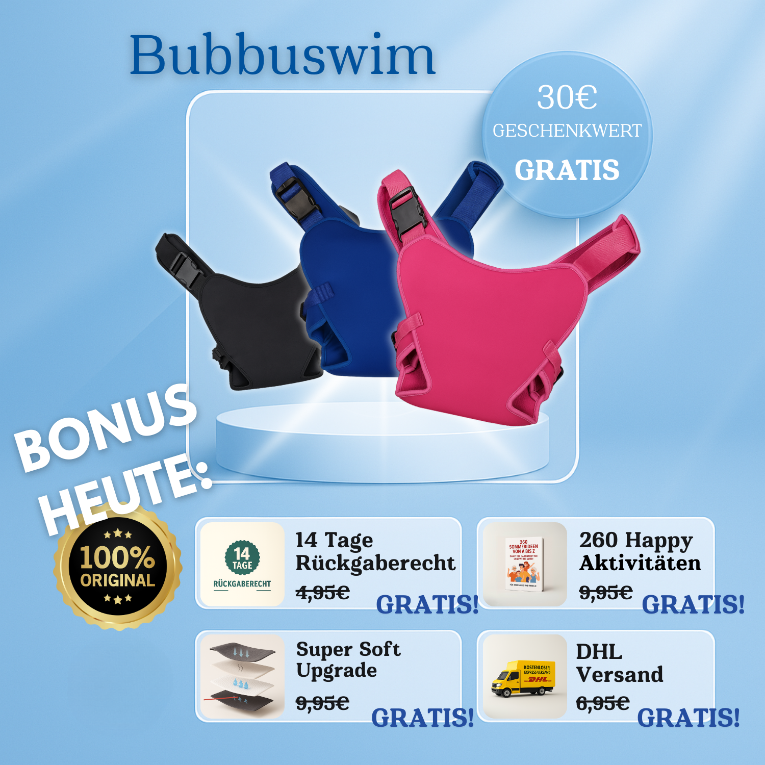„BubbuSwim ist basically dein Baby-Trage-Gamechanger, nur bequemer: super weich, sitzt perfekt und gibt dir Sicherheit – ohne Zwicken, ohne Stress. Macht den Gang an den Strand oder Pool easy – egal, wo du gerade bist.“
